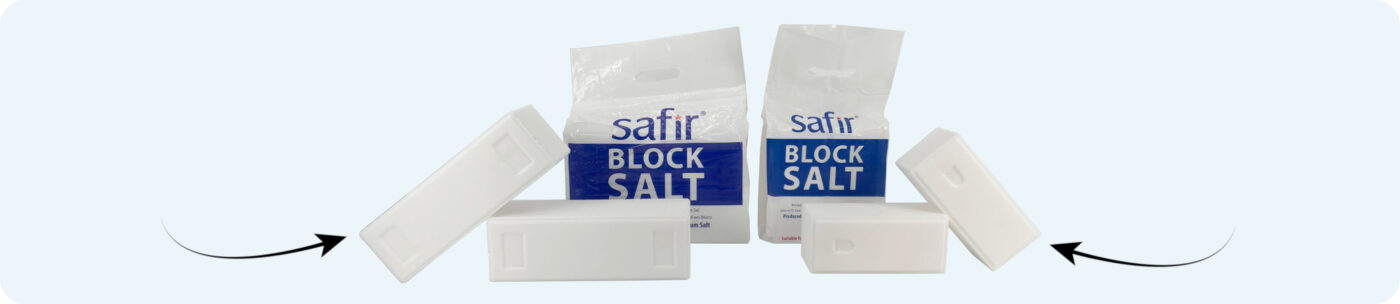 Zie hieronder een vergelijking in vorm/ formaat tussen onze 2.15kg Safir zoutblokken (links) en de “2.15 KG curved” blokken (rechts).